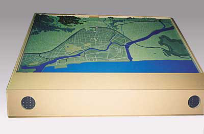 ※ステレオスピーカー付ナレーション式説明模型。またボタンを押すと洪水予想区域がブルーに光る仕組みとなっています。